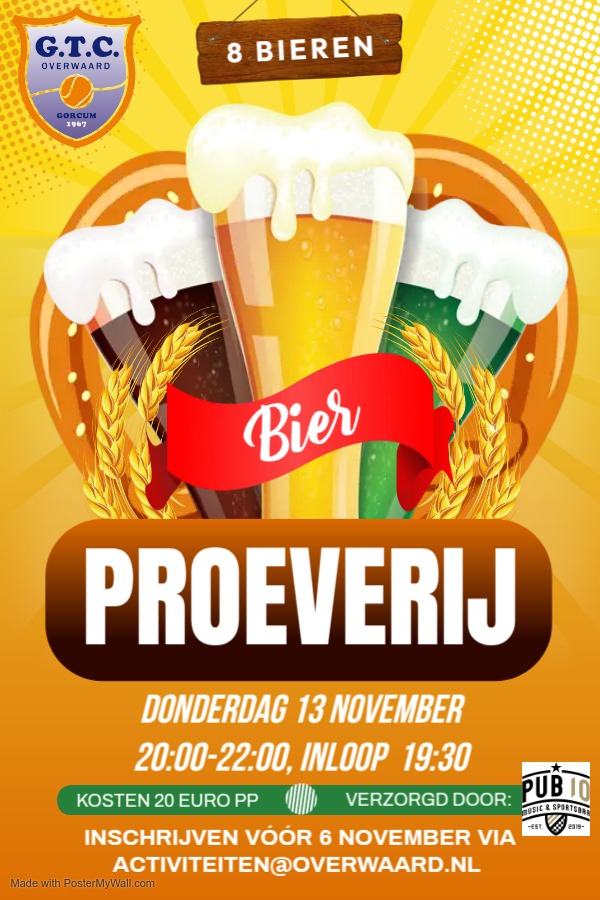 Op donderdagavond 13 november organiseert de activiteitencommissie een bierproeverij bij Overwaard. De proeverij vindt plaats van 20:00-22:00 (inloop vanaf 19:30) en wordt verzorgd door Pub10. We zullen deze avond maar liefst 8 bieren proeven, waarbij we van licht naar zwaar bier gaan. Het inschrijfgeld bedraagt 20 euro (vooraf via Tikkie te voldoen), zorg dat je je inschrijft vóór 6 november via [email protected] of een van de commissieleden. Maar vol is vol, dus schrijf je snel in!!
